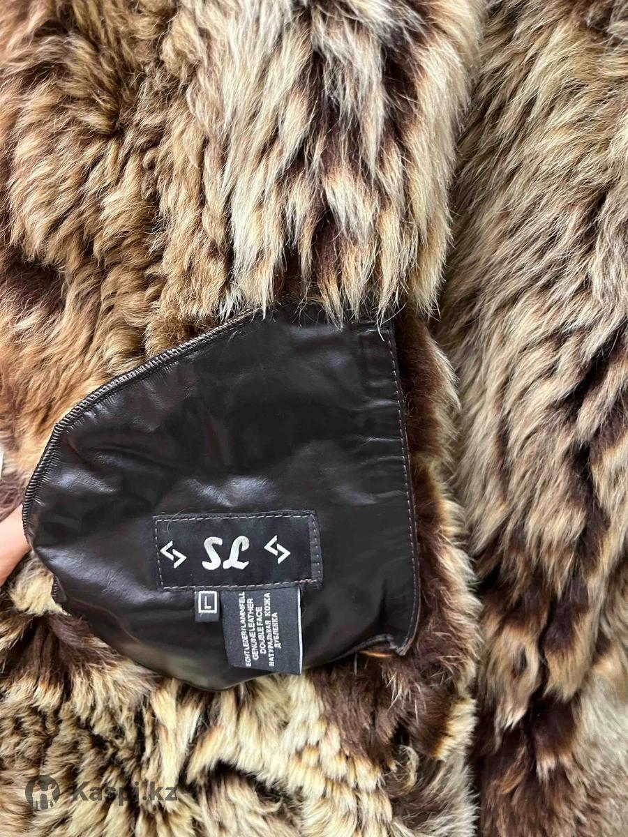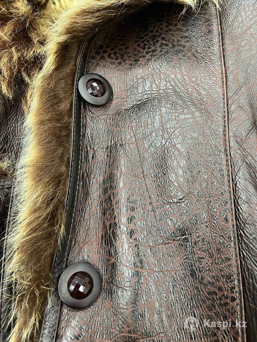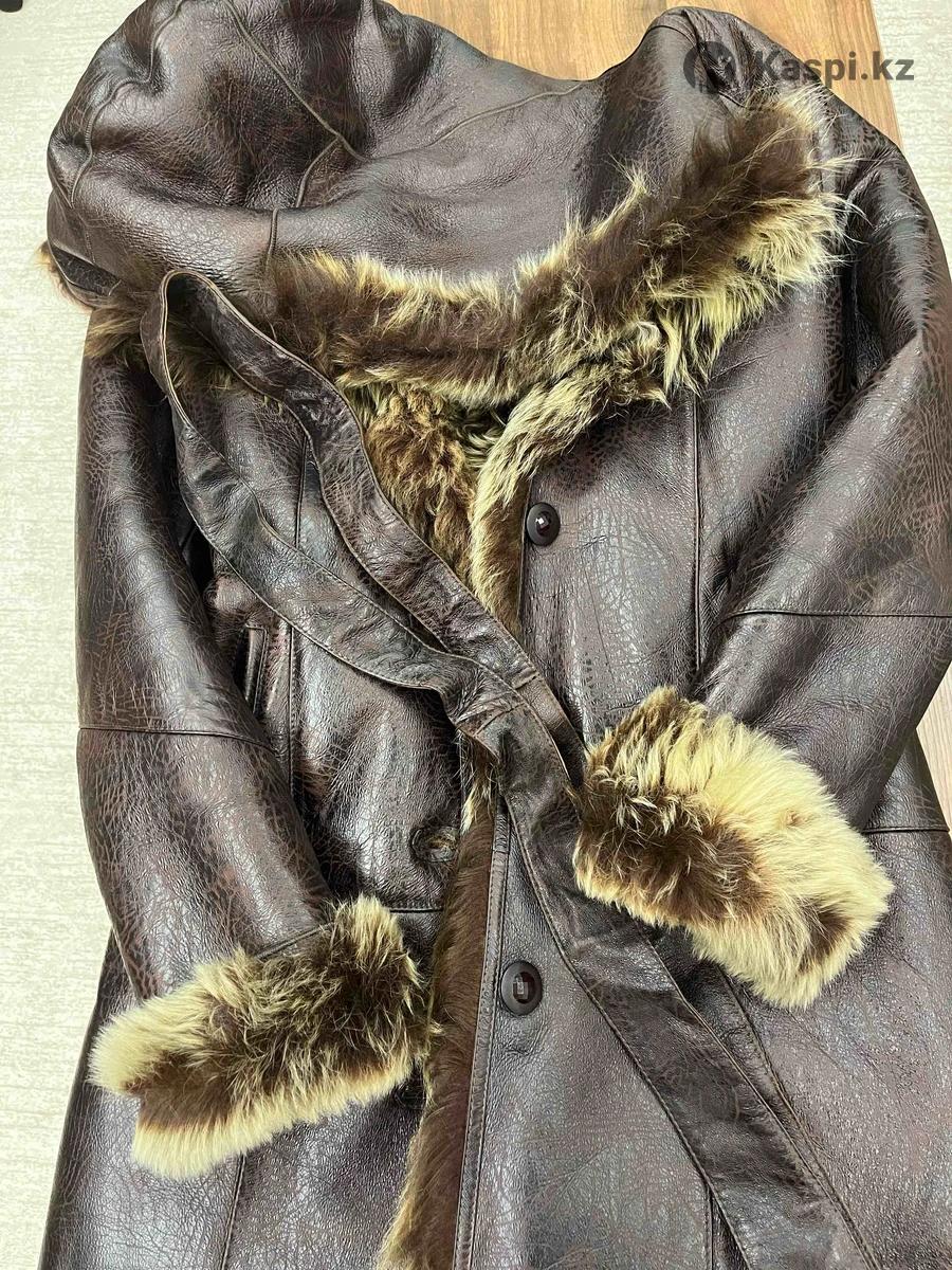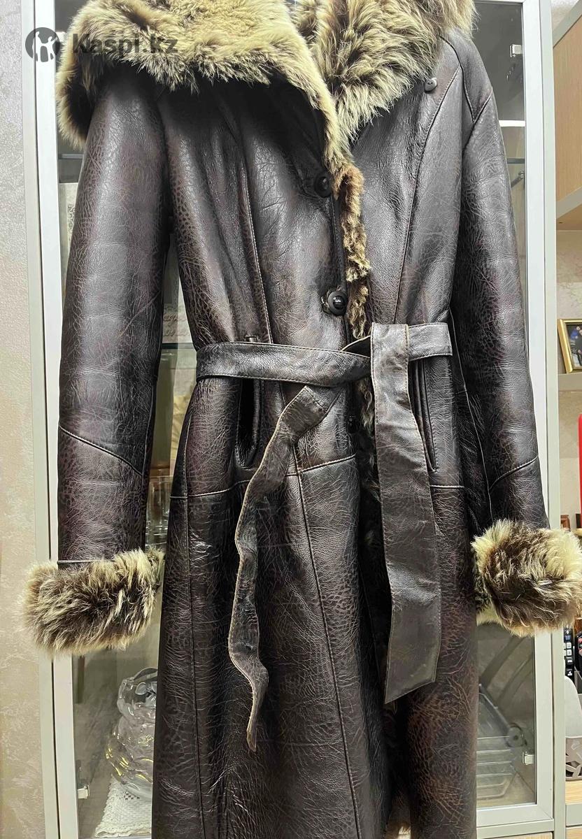Размер 46-48. Снаружи натуральная кожа, внутри натуральный мех. Есть капюшон и пояс. Длина от плеча: 102 см