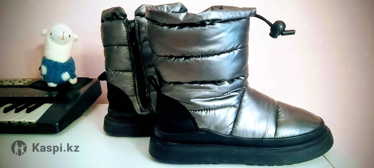 Зимние дутики Zara оригинал. Теплые, легкие, удобные. Носили одну зиму, состояние отличное. Мягкая внутренняя подкладка, застежка молния сбоку и удобная фиксация сверху шнурком. Цвет - металлический серый. Длина по стельке приблизительно 18 см.