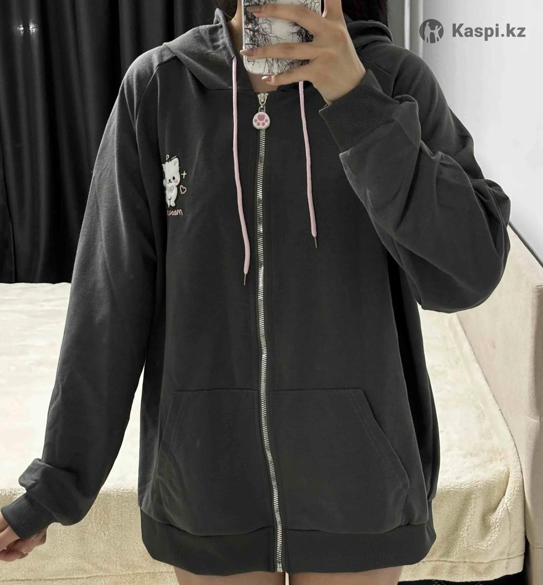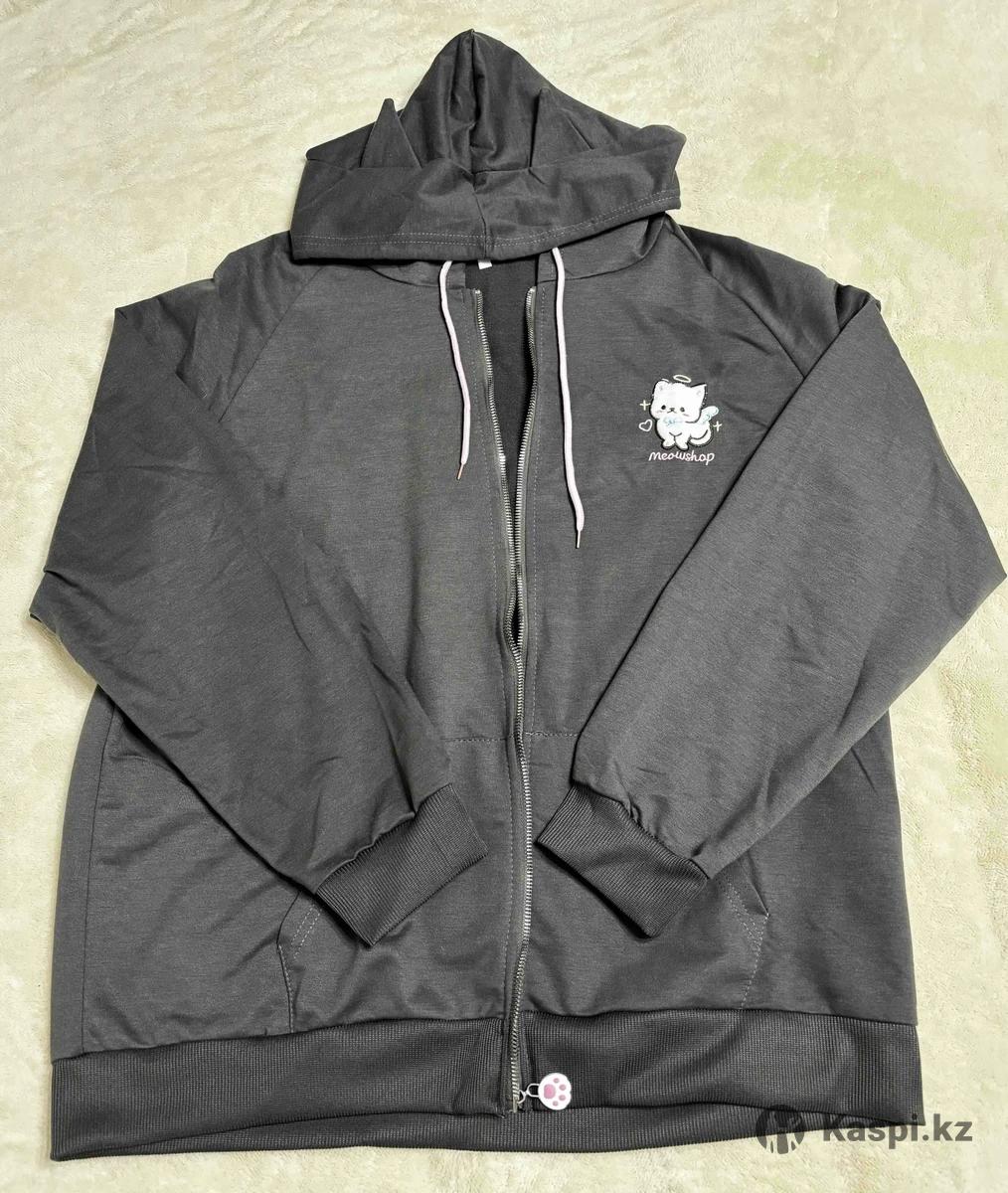Женская хип кофта серого цвета с принтом кошечки, лапкой на молнии и кошачьими ушами на капюшоне. Размер 2XL. Новая, ни разу не носилась.