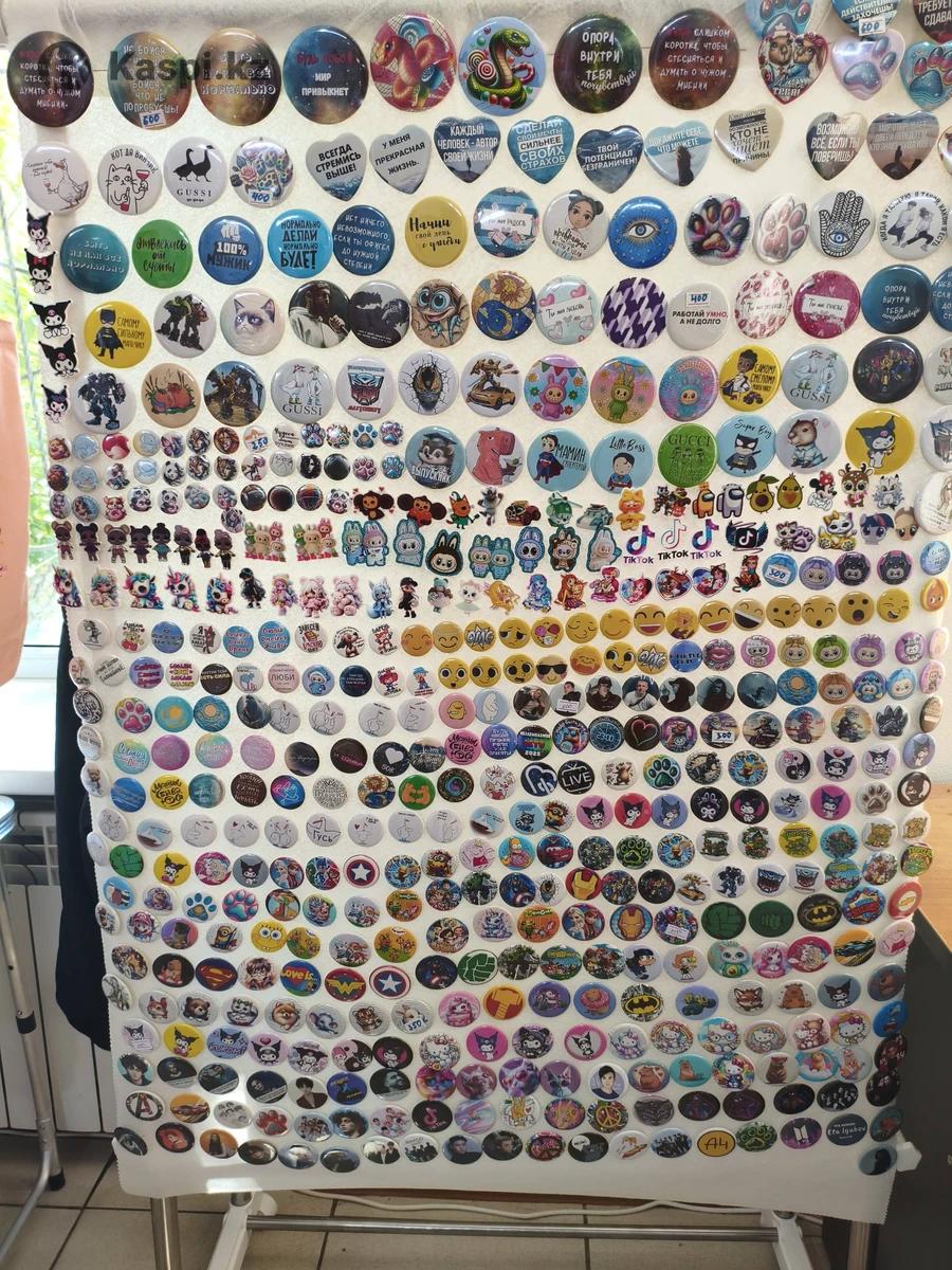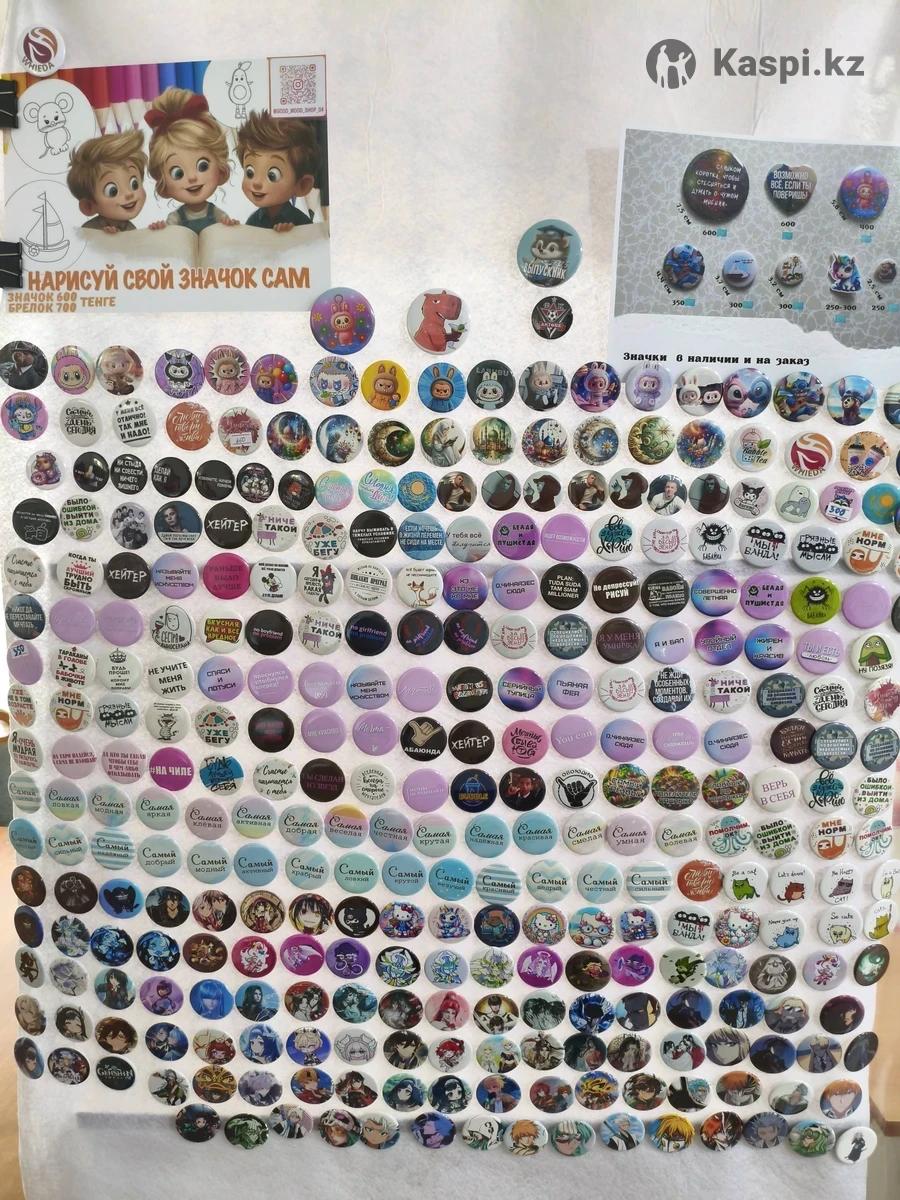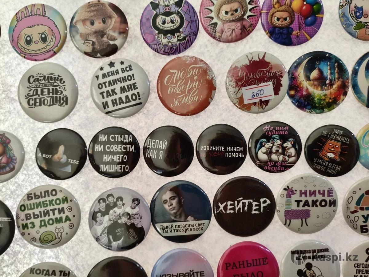 Закатные значки от 2,5 до 7,5 см. От 250 до 600 тг. В наличии и на заказ.