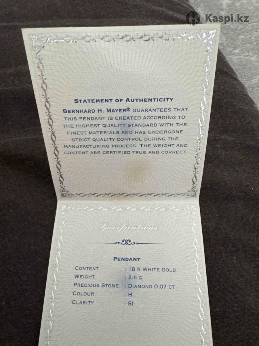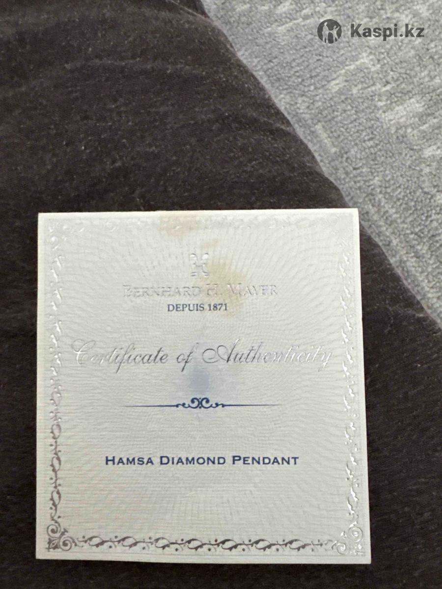 Подвеска Bernhard H. Mayer «Hamsa Diamond Pendant» (белое золото 750, бриллианты) с сертификатом Продаю оригинальную ювелирную подвеску класса люкс от швейцарского бренда Bernhard H. Mayer (основан в 1871 г.). Модель — Hamsa Diamond Pendant. ✔ Белое золото 750 пробы (18К) ✔ Вес: 2,01 г ✔ Инкрустация: бриллианты ✔ Символ Хамса — оберег, символ защиты и удачи ✔ В комплекте: оригинальная коробка и Certificate of Authenticity Состояние отличное, не носилась. 💰 Цена: 250 000 тг (возможен торг, рассмотрю предложения).